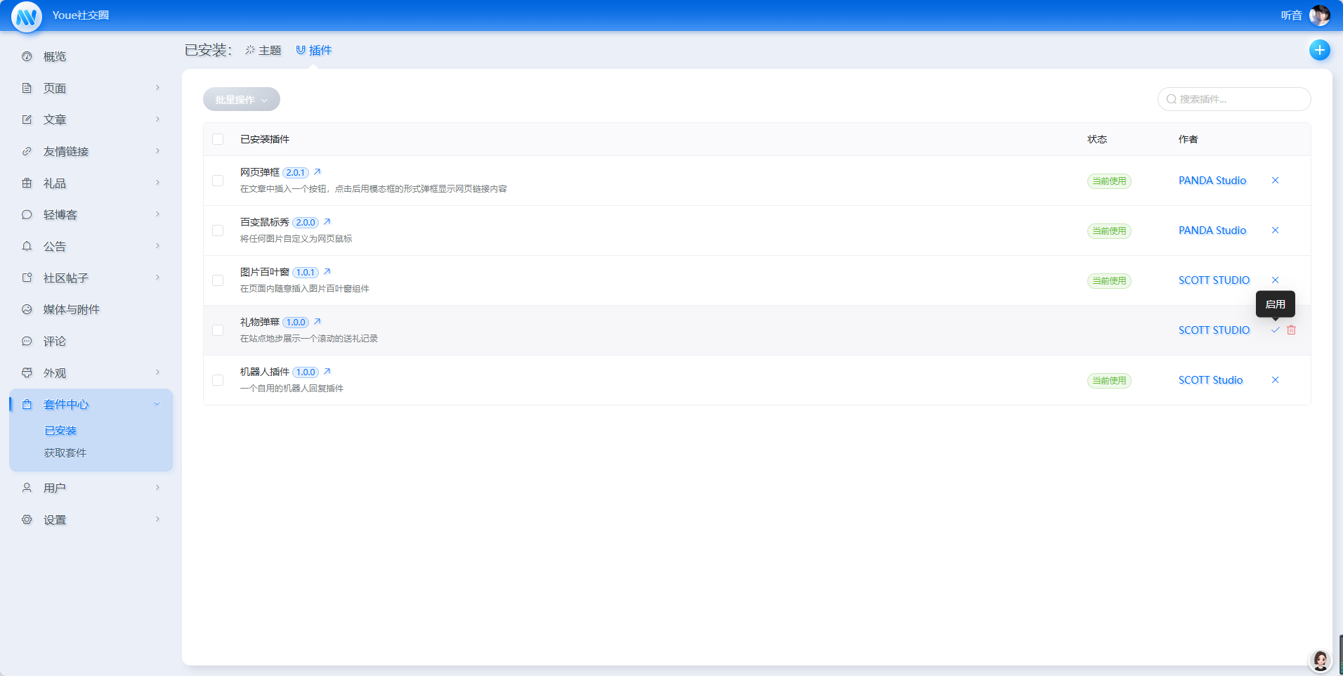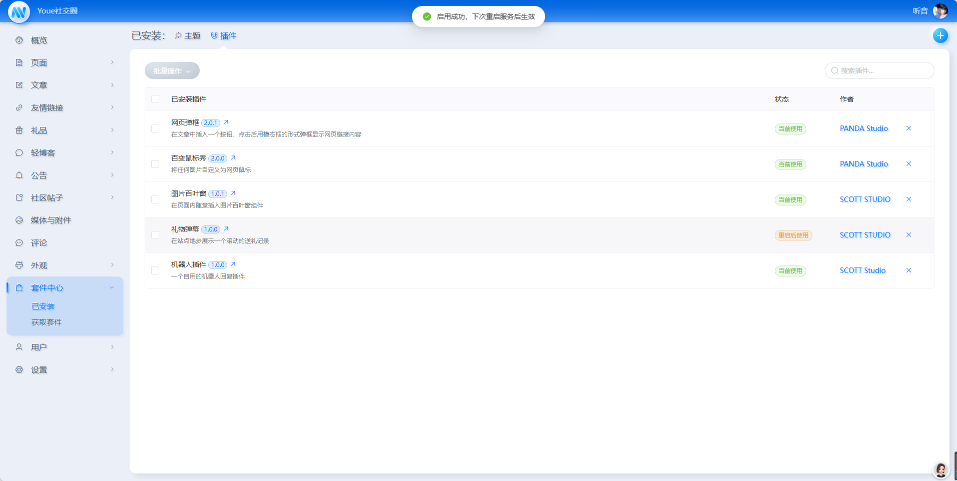 管理后台>套件中心>已安装>插件>启用(礼物弹幕)>立即重启主题