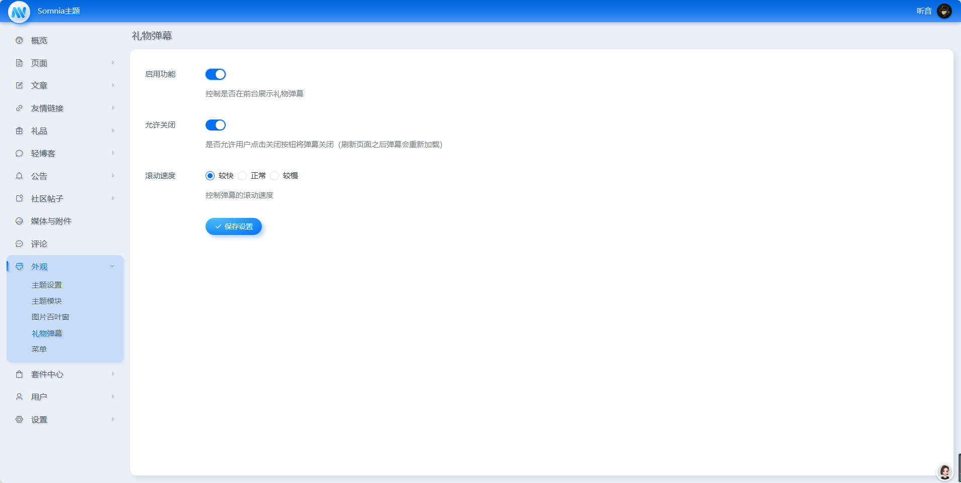 安装重启后>管理后台>外观>礼物弹幕>启用