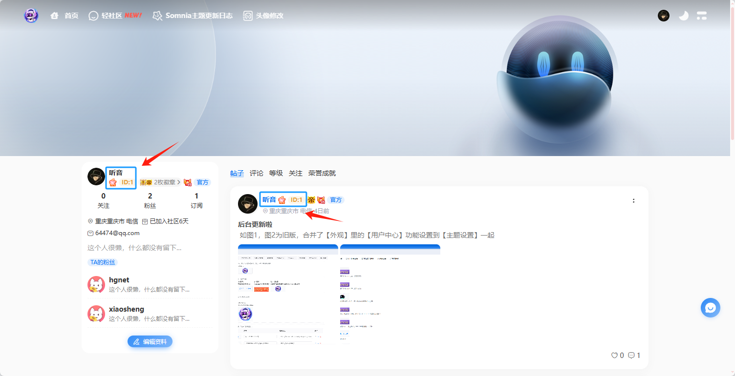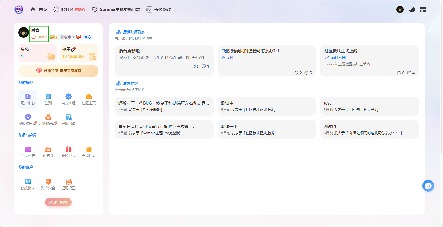 Somnia主题提供ID靓号外显功能,能更好的促进站内互动社交,属于交互增强功能。